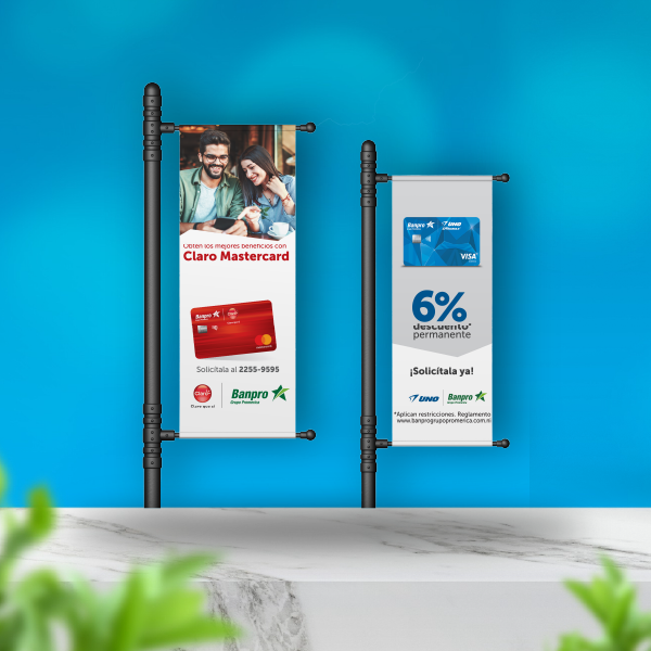 Banderolas impresas para eventos, ferias o puntos de venta, con estructura fácil de montar y alta calidad de impresión para destacar tu marca.